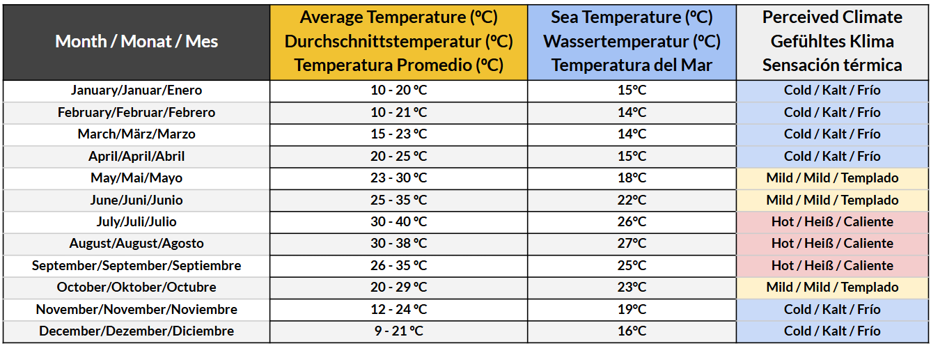 - Summers (June to August): Warm and sunny, with average temperatures between 25°C and 35°C. Perfect for those looking to enjoy the sea and outdoor activities.